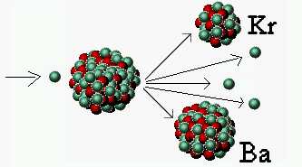 Exemple de fision induite: sur cette image, on peut voir un noyau d'Uranium 235 qui, aprés avoir reçu un neutron, se divise en Krypton et en Baryum + 3 neutrons.